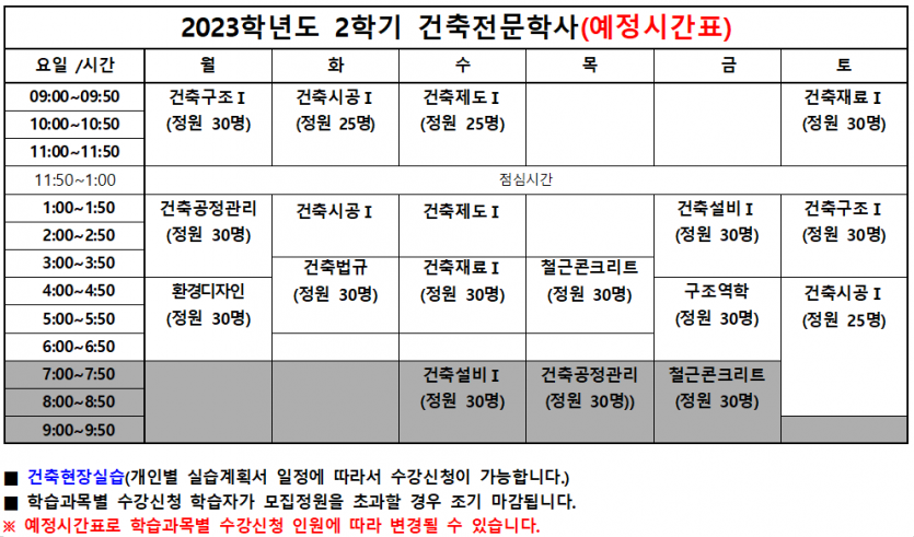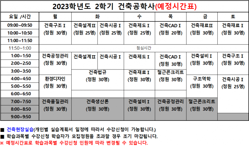 건축공학 시간표는 예비 시간표이며, 상황에 따라 과목 변경 및 이동이 있을 수 있으니