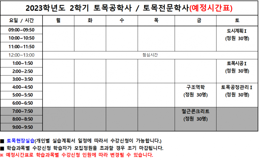 현재 시간표는 예비시간표이며, 학기 개강전까지는